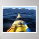 Photograph of the front of a yellow kayak in water with mountains ahead.