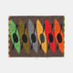 Kayaker Fleece Blanket, artist drawn kayaks in earth tone colours of orange, red, grey, brown and green on a dark brown background. Perfect gift for anyone who loves kayaking.