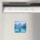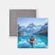 Magnet with an illustration of a man kayaking in the ocean by the snow topped mountains. Pretty serene blue tranquil water and pine trees surround him on a peaceful journey.