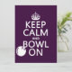 This reads 'Keep Calm and Bowl On' in the style of the original Keep Calm posters. There is a silhouette of a bowling ball beside the words. It's a clean fun design perfect for anyone who loves to bowl.