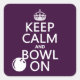 This reads 'Keep Calm and Bowl On' in the style of the original Keep Calm posters. There is a silhouette of a bowling ball beside the words. It's a clean fun design perfect for anyone who loves to bowl.