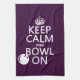 This reads 'Keep Calm and Bowl On' in the style of the original Keep Calm posters. There is a silhouette of a bowling ball beside the words. It's a clean fun design perfect for anyone who loves to bowl.