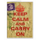 Popular British vintage keep calm and carry on motivational slogan saying on an antique retro postcard with old Queen Elizabeth the 2nd postage stamp. Copyright Oconnart