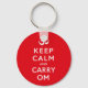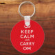 In this design the Devanagari symbol for Om is at the top; in the original war poster it is a crown. The text is in the same font but the wording differs slightly and appears as Keep Calm And Carry Om instead of Keep Calm And Carry On.
