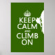 This reads Keep Calm and Climb On, in the style of the classic keep calm poster. There is a rock climber climbing to one side of the words. It makes a beautiful range of products, popular with anyone who loves to climb.