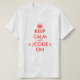 Keep calm and code on t-shirt for programming nerd or hackathon event. Create your own funny Keep calm and carry on parody. For example with html php java javascript perl sql. Customise background colours and text the way you want it.