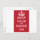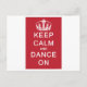 The "Keep Calm and Dance On" design in red has people partying on a dance floor in front of big speakers and disco ball in the shape of the crown of the classic "Keep Calm and Carry On" posters.