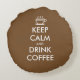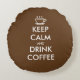 Brown keep calm and drink coffee round throw pillow. Personalizable template for making your own funny keep calm and carry on parody. Vintage keepcalm typography with little pixelated coffee cup. Create your own keepcalmandcarryon spoof. Funny cafe decor for sofa couch or chair. Customisable colour / colour. Double sided design.