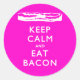 Keep Calm and Eat Bacon. Devour rashers of bacon calmly? Not! Based on the World War Two Poster, "KEEP CALM AND CARRY ON". White text and image over a lovely pink background. “KEEP CALM AND EAT BACON”.