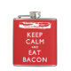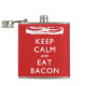 Keep Calm And Eat Bacon. Bacon will calm you, love you and keep you…. well, YOU! Devour delicious bacon and self-actualise. Based on the World War Two Poster, "KEEP CALM AND CARRY ON". White text and image over a red background.