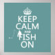 This reads Keep Calm and Fish On, in the style of the classic keep calm poster. There is a silhouette of a fisherman sitting on the edge of the words, his rod hanging off the edge. It's a beautiful simple design, which will be loved by everyone who loves to fish.
