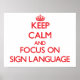 Use the search tool at my store to find other Sign Language merchandise. Keep Calm and focus on Sign Language products available on tshirts,sweatshirts,kids shirts, infant onsies, stickers, magnets, and much more Sign Language clothing fully customisable to your specifications. If you like what you see, please link to my store (www.zazzle.com/shirtsforall) or email a friend.