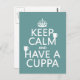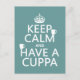 This reads Keep Calm and Have a Cuppa, in the style of the classic keep calm poster. Mugs of hot tea and coffee sit on the letters. It's a wonderful friendly design, great for any tea room or cafe. More english in its sentiment even than the original, and more honestly what we do in times of crisis.