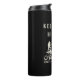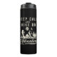 This thermal tumbler is perfect for a hiking enthusiast. The design features the words "Keep Calm And Hike On", and "Adventure Awaits" with a silhouette of a hiker, mountain, trees, sun, bird and grass between the words. This will make a great gift for a hiker.