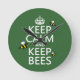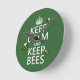 This reads Keep Calm and Keep Bees. Cartoon bees buzz alongside the words. It's a beautiful design, really popular with anyone interested in beekeeping and bee conservation.