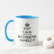 Keep calm and let the bookkeeper handle it funny coffee Mug gift. Create your own funny Keep Calm and Carry On parody. Modern typography template with crown. Fun personalised cups for home or office. Add your own custom text. Cool Birthday or Christmas gift idea for friends, family, coworker, colleague, boss, staff, employees, corporate workers, personnel, accountant, controller etc. Blue coloured handle and inside. Double sided print.