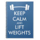 Keep calm and lift weights note book journal. Keepcalm writing notepads for weightlifting, bodybuilding and fitness. Vintage gift idea for sports gym. Personalizable text design and background colour. ie blue. Create your own Keep calm and carry on office supply design. Slogan parody examples: Keep calm and lift on. Keep calm and pump iron Keep calm and power lift. Cool gift idea for bodybuilder or weightlifter. Barbell icon.