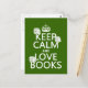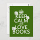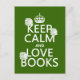 This reads Keep Calm and Love Books, in the style of the classic keep calm poster. It is decorated with small piles of books sitting on the letters. It's a beautiful and popular design, which is loved by everyone who loves books, whether a reader or writer. It's available on a wide range of products, making wonderful gifts for book sellers, librarians, writers and anyone who reads.