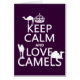 The design reads 'Keep Calm and Love Camels'. It is in the style of the traditional poster, and is decorated with silhouettes of camels on the letters. It's beautiful and clean and popular with all fans of camels. Makes great gifts for the camel lover in your life.