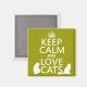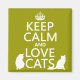 This is the classic "Keep Calm and Carry On" war poster, reworded to "Keep Calm and Love Cats". It's written in white on coloured background, and is accompanied by silhouettes of cats sitting near the words.