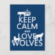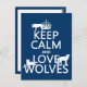 This reads Keep Calm and Love Wolves. Three wolf silhouettes lounge on the words. It's a beautiful design, perfect for anyone who loves wolves.