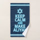 Glowing blue and white text reading "KEEP CALM AND MAKE ALIYAH." Aliyah (עלייה), meaning ascent, is the Hebrew word for immigration to Israel from the diaspora. Aliyah is considered to be "going up" in the direction of Jerusalem. What are you waiting for?