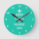 Keep Calm and nurse on custom wall clock. Mint green Keep Calm wall clock with numbers and medical cross icon. Create your own funny keep calm and carry on parody. Funny Birthday gift idea for RN nurse, registered nurse, caregiver, caretaker, student, assistant, doctor, friend, coworker, colleague, etc. Cute wall decor for hospital, nursing home, office, dorm, surgery room, bedroom, kitchen, sleeping quarters, dormitory, school, apartment, hospice etc. Also nice as present for nurses week, nurse day.