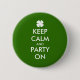 Keep calm and party on St Patricks Day party pinback buttons. Funny green St Pattys day accessories. Humourous quote with lucky shamrock 4 leaf clover. Change quantity to get the cheapest bulk price per badge.