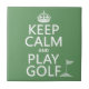 This is the traditional poster reworded to 'Keep Calm and Play Golf'. Excellent words to live by! There is a small flag next to the words. It's a popular design, loved by golfers and golf fans. Available on a wide range of products, it makes great gifts and giveaways for golf enthusiasts.