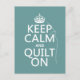 This reads Keep Calm and Quilt On, in the style of the classic keep calm poster. There is a needle piercing the letters, with thread dangling. It's a whimsical beautiful design which appeals to everyone who loves to quilt.