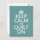 This reads Keep Calm and Quilt On, in the style of the classic keep calm poster. There is a needle piercing the letters, with thread dangling. It's a whimsical beautiful design which appeals to everyone who loves to quilt.