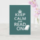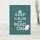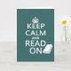 This is the classic "Keep Calm and Carry On" war poster, reworded to "Keep Calm and Read On". It's written in white on coloured background, and is accompanied by a silhouette of a book to one side.