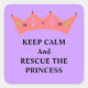 A fun design says 'keep calm and rescue the princess, a pink princess crown on a soft purple background.