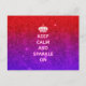 Keep Calm and Sparkle on with a crown and on an image of red to purple gradient glitter. This design is a play on the famous "Keep calm and carry on" quote.