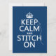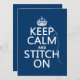 This reads Keep Calm and Stitch On, in the style of the classic keep calm poster. There is a needle piercing the letters, with thread dangling. It's a beautiful simple and eye catching design which will makes a fun range of products loved by everyone who loves to sew.