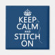 This reads Keep Calm and Stitch On, in the style of the classic keep calm poster. There is a needle piercing the letters, with thread dangling. It's a beautiful simple and eye catching design which will makes a fun range of products loved by everyone who loves to sew.