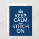 This reads Keep Calm and Stitch On, in the style of the classic keep calm poster. There is a needle piercing the letters, with thread dangling. It's a beautiful simple and eye catching design which will makes a fun range of products loved by everyone who loves to sew.