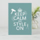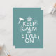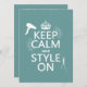This reads Keep Calm and Style On, in the style of the classic keep calm poster. There are frills and spirals on the letters, and silhouettes of scissors and a hairdryer. This is a popular design with people in all aspects of the beauty industry, and makes great gifts too.