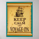 "Keep Calm and Voyage On," romanticises aspects of the unknown, reminiscent of seafaring adventure, the search for lost treasure, secret maps on brittle parchment paper and life on the open ocean. To voyage on is to persist, the blue background represents the deep ocean and life’s challenges.