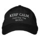 Funny music cap has embroidered banjo slogan that says Keep Calm and Play The Banjo. Great as a music gift for any banjo picker in a bluegrass band.
