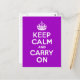 A vintage-style "Keep Calm and Carry On" design on a bright rainbow purple.