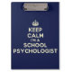 Fun "keep calm" clipboard for a school psychologist. Featured in a navy blue with crisp white lettering. Customise with a name at the bottom, if desired. Simply click the customise button below the item and type in a name or initials.
