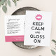 Share lipstick application tips and additional tips and tricks with your customers with these cute double sided postcards. Front side features "keep calm and gloss on" topped by a vibrant pink lip print illustration. Flip over to reveal two fields for tips and tricks with completely editable text, and three lines of contact information along the bottom.