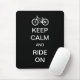 This fun design features a white bicycle silhouette on a black background with the text "Keep Calm and ride on" in white.