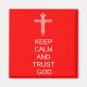 Inspired by the British World War II poster, "Keep Calm and carry on", this design features a white cross and the text, "Keep Calm and Trust God."
