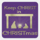 Simple nativity scene, dark purple background, shaded gold silhouette figures. Baby Jesus accented with beams of light. Keep CHRIST in CHRISTmas