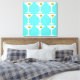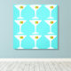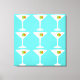 This Keep 'Em Coming Martini Stretched Canvas features a turquoise background and the tiled image of a white silhouette of a martini glass. Inside each glass is a glorious green olive with an orange pimento. This is a fun piece of wall art for everyone who wishes they were a character in a classic movie. Shaken not stirred, please!
