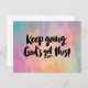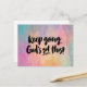 Modern Typography design with words in black calligraphy script, "Keep Going. God's Got This!" on colourful watercolor background.
