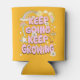 Retro style motivational "Keep going keep growing" text design with mushroom, flowers, stars, rainbow, clouds and sun decoration