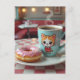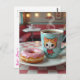 Say hi to a friend or family member with this sweet postcard featuring a strawberry doughnut and a cup of warm coffee at the diner. The coffee cup has a cute Kawaii cat. Cute pastel retro colours like pink and teal.